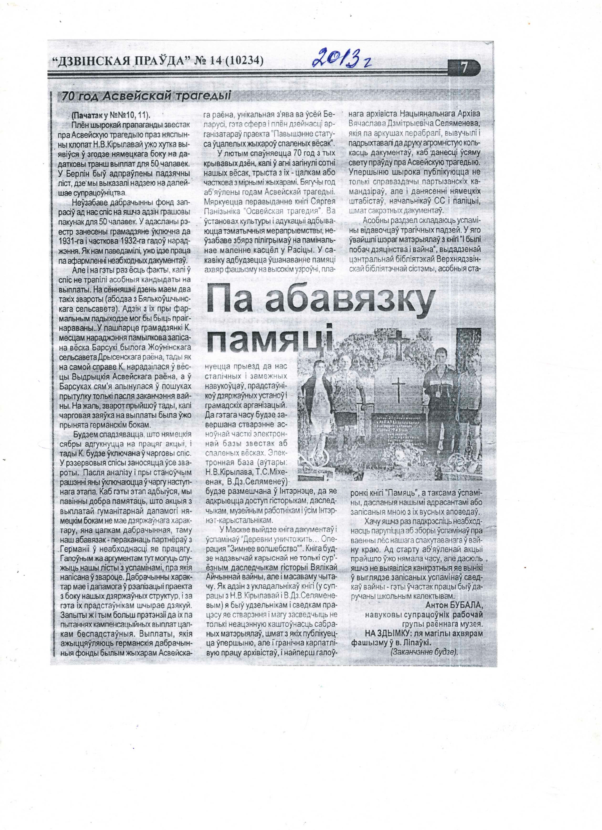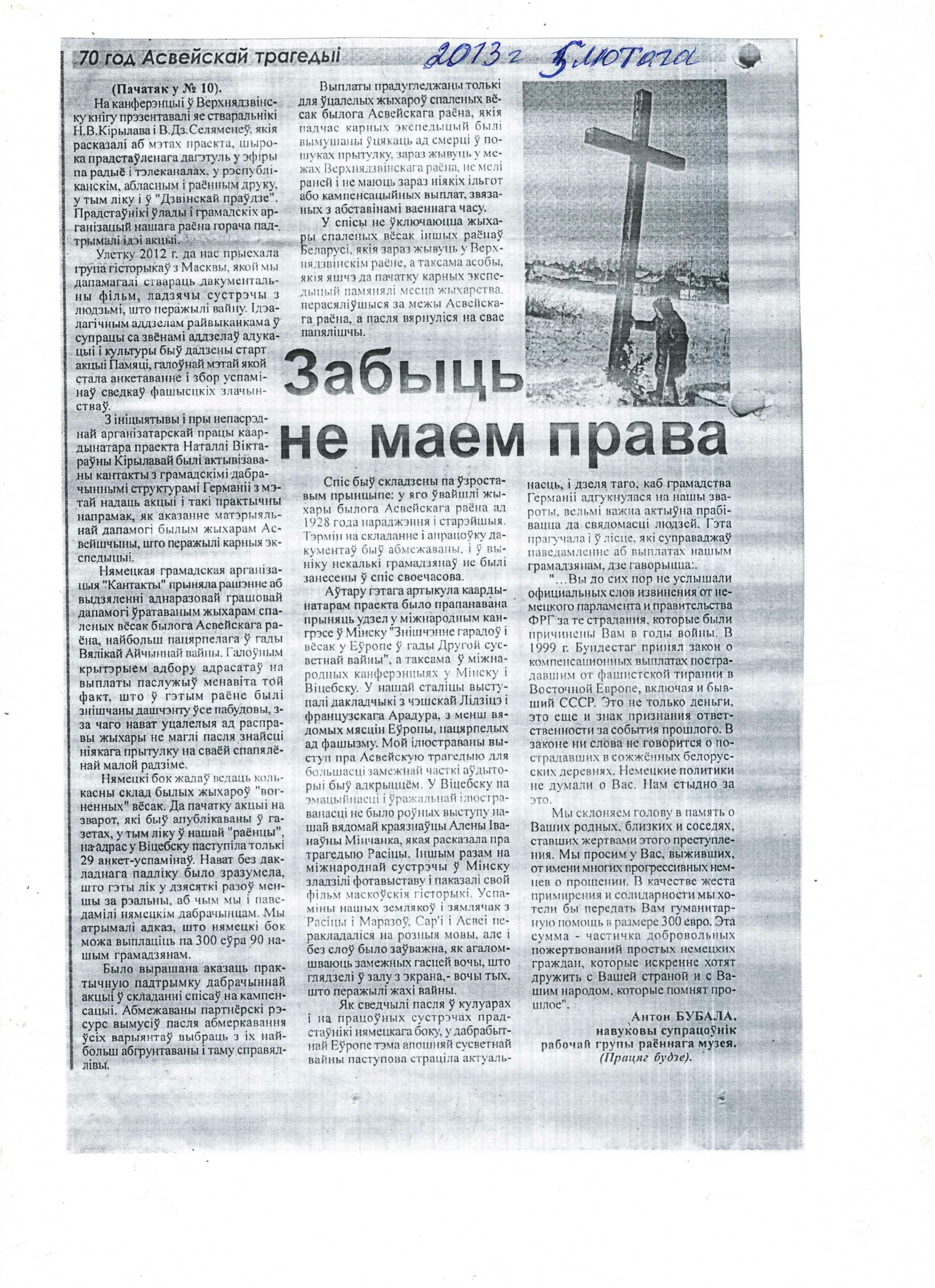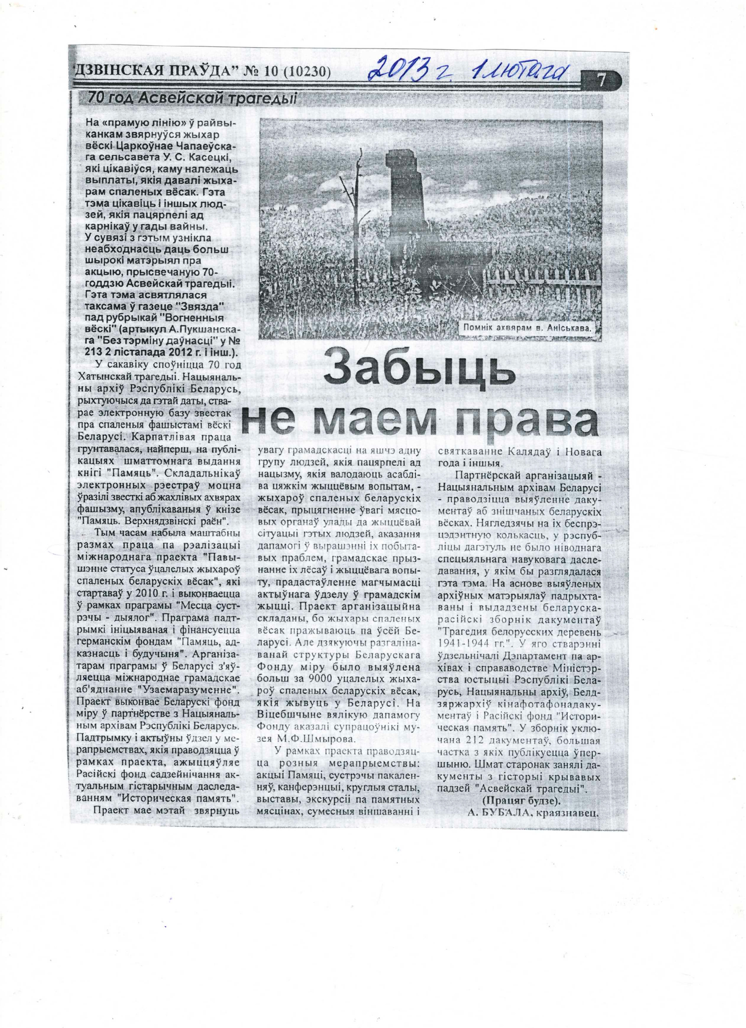 Бубала, А. Забыць не маем права / Антон Бубала // Дзвінская праўда. – 2013. – 5 лютага. – C.2. – Працяг. Пачатак у №10.