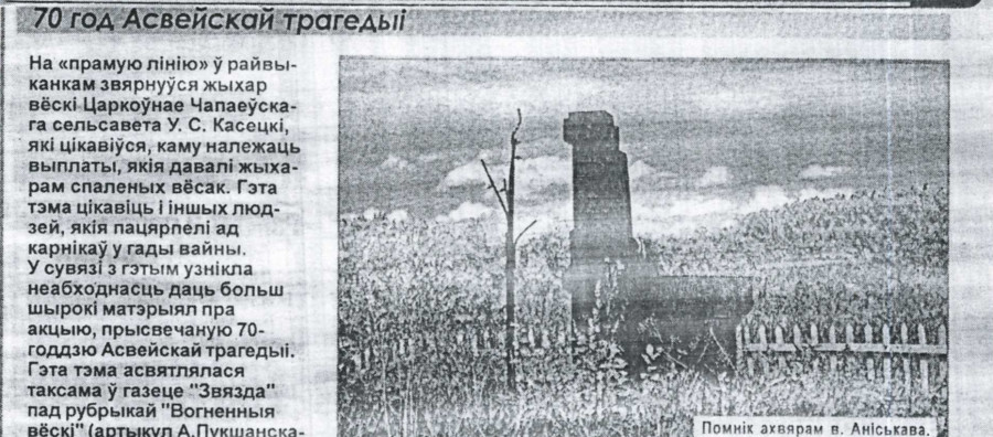 На "прамую лінію" ў райвыканкаме звярнуўся жыхар вёскі Царкоўнае Чапаеўскага сельсавета У.С. Касецкі, які цікавіўся, каму належаць выплаты, якія давалі жыхарам спаленых вёсак.